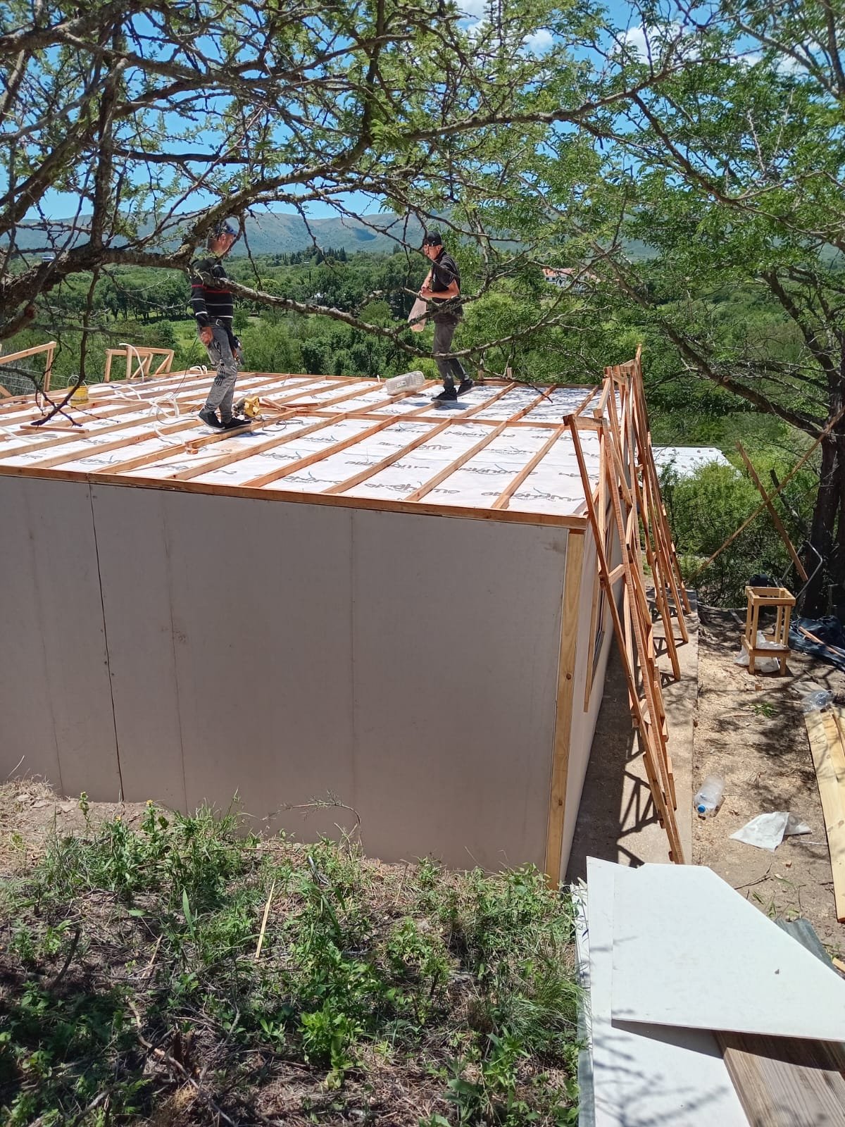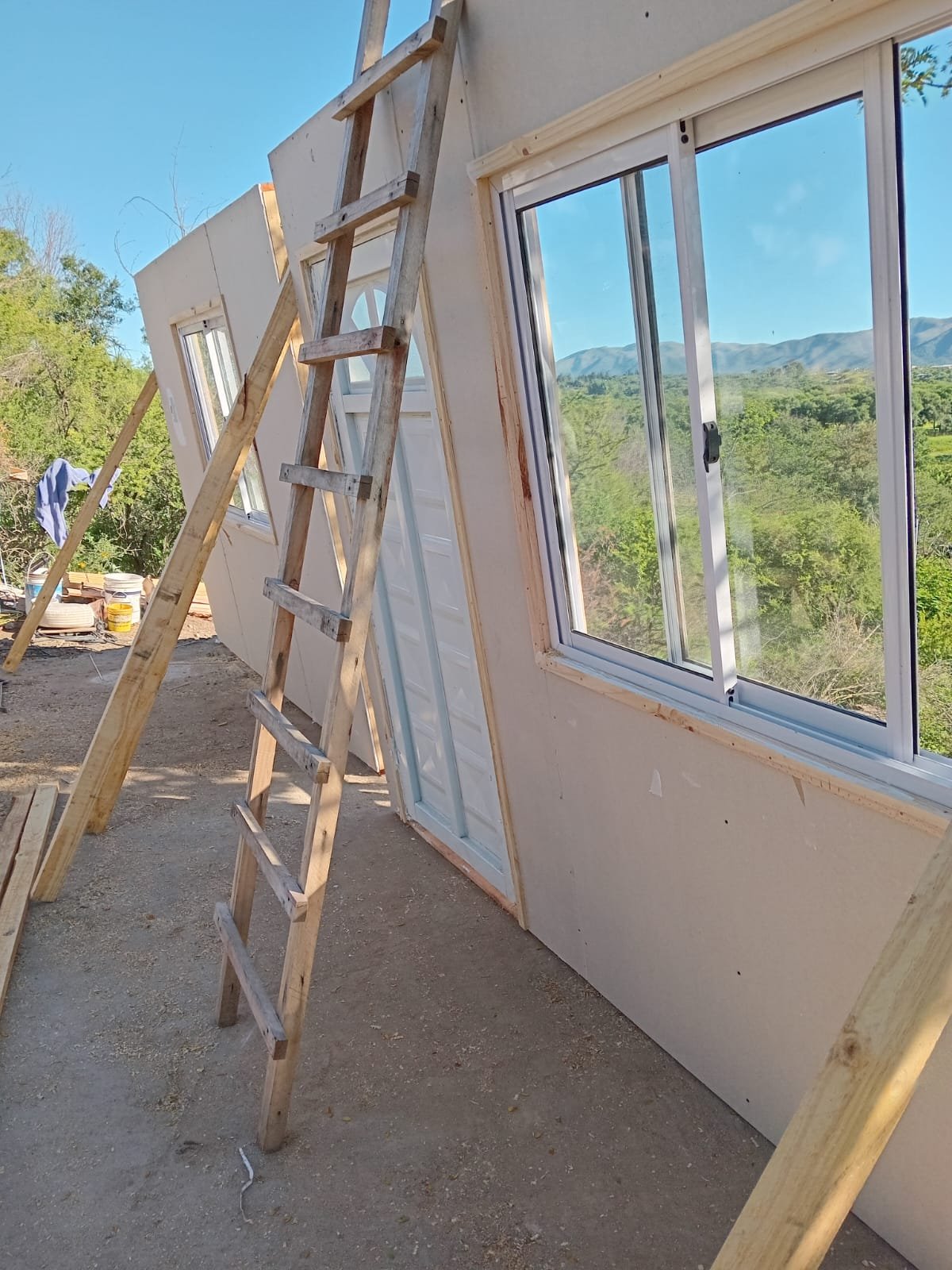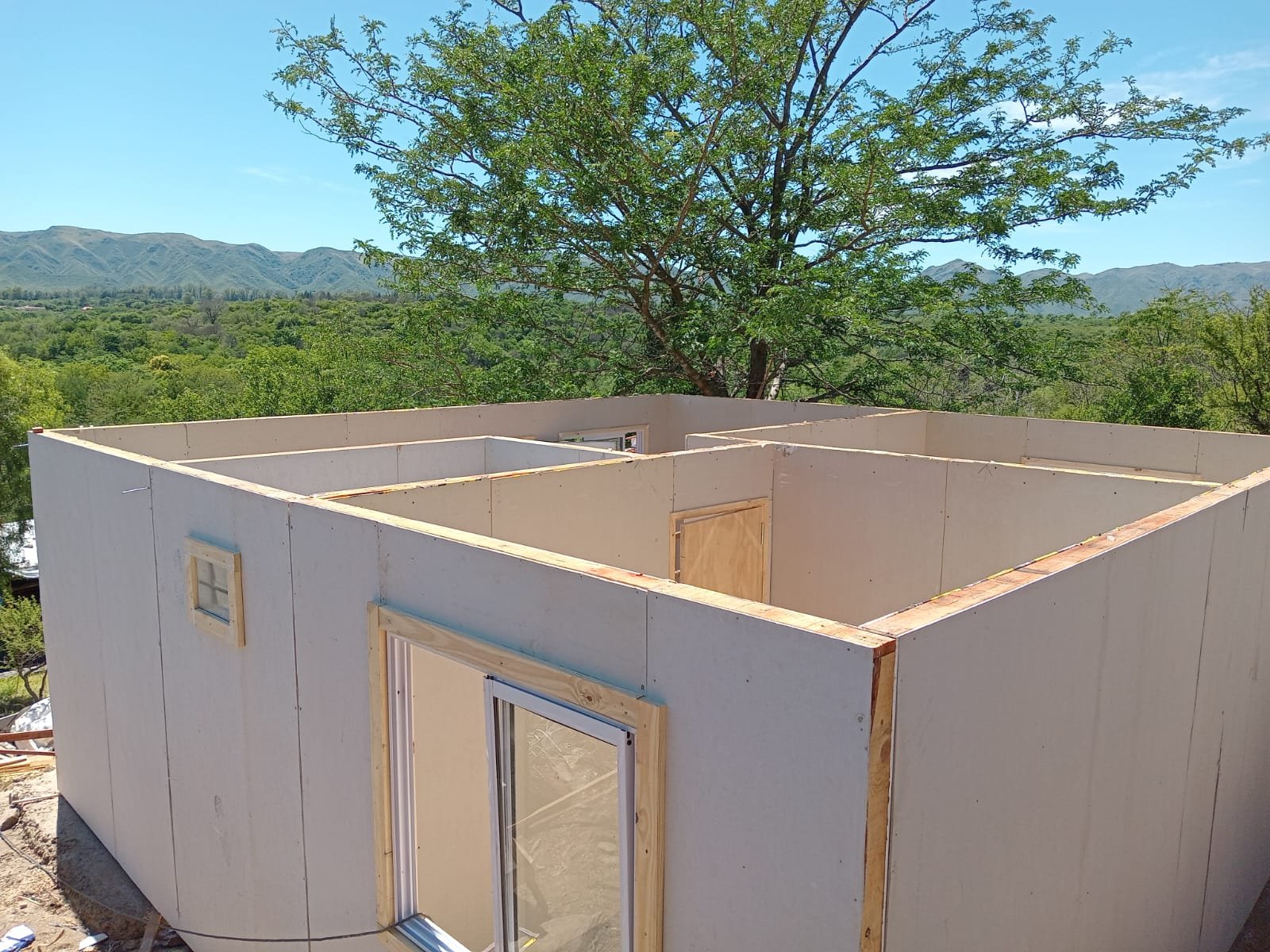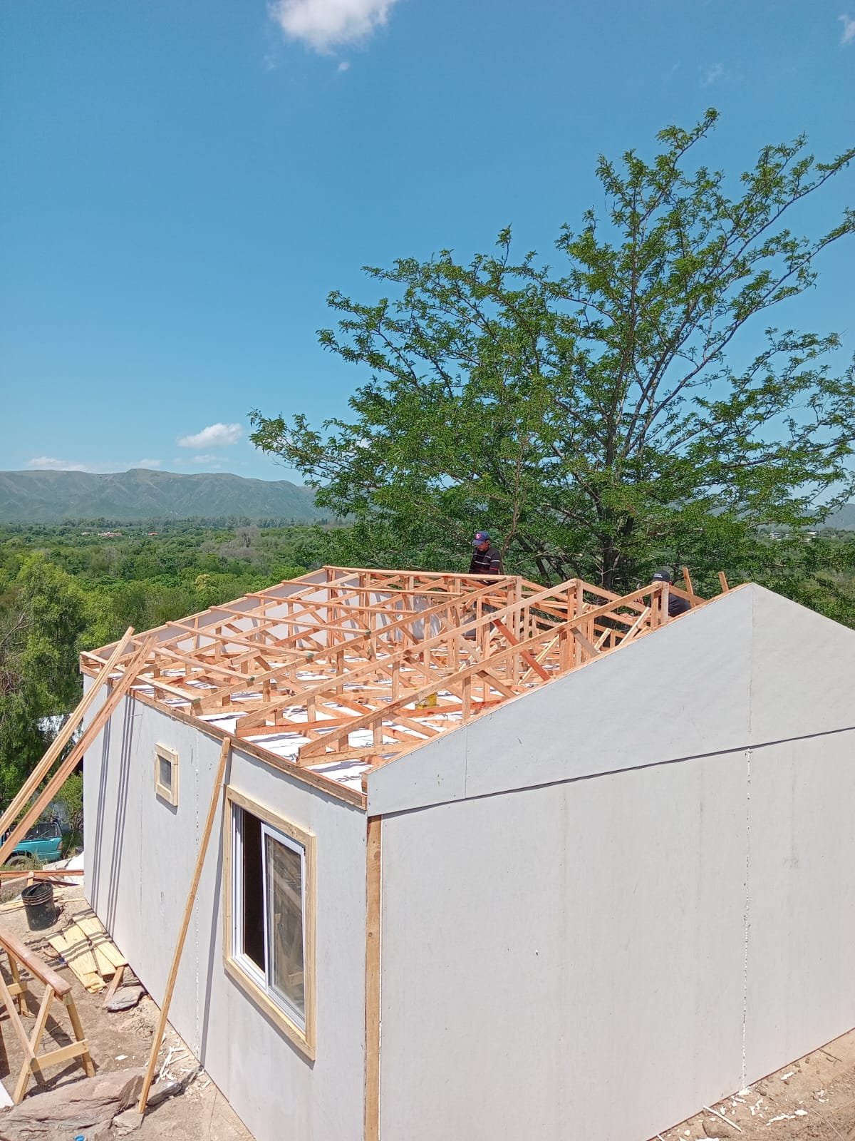 Ubicada en una zona elevada de Cosquín, esta vivienda estilo americano a dos aguas nos presentó un desafío logístico único: el terreno se encontraba a aproximadamente 5 metros sobre el nivel de la calle, lo que impedía levantar las paredes directamente desde el camino —cada panel pesa cerca de 300 kg.
